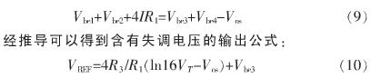 基準(zhǔn)源中運(yùn)放的設(shè)計(jì)是非常重要的,運(yùn)放的失調(diào)是基準(zhǔn)源的一個主要誤差源。由于不對稱性,運(yùn)放會受到輸入失調(diào)的影響。假設(shè)失調(diào)電壓為Vos,經(jīng)計(jì)算得到含失調(diào)電壓的輸出公式為: