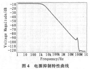 圖4是在1 Hz到10 GHz的范圍進(jìn)行掃描所得到的不同的電源抑制情況。低頻時抑制情況不太好,在-10 dB左右,還有待于提高;高頻抑制情況很好,基本穩(wěn)定在-120 dB左右。與傳統(tǒng)電路相比,本文提出的這種電路可以用于在各種系統(tǒng)尤其是高頻系統(tǒng)中,這一點(diǎn)是傳統(tǒng)電路所無法比擬的。