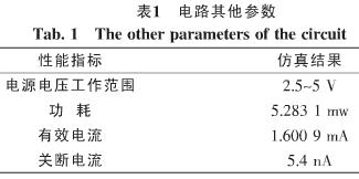 電路的其他方面的性能仿真結(jié)果如表1所示。表1的仿真結(jié)果是在電源電壓為3.3 V的條件的測得的。有效電流指的是在電路正常工作的情況下從電源到地之間的電流,關(guān)斷電流指的是在電路不工作的情況下從電源到地的漏電流。