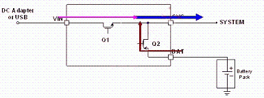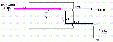 LD6275 具有適應(yīng)性電源路徑管理(Adaptable Power Path Management, APPM)功能,其為以供給系統(tǒng)端用電為主,對電池充電為輔,如圖3所示;當(dāng)系統(tǒng)用電超過輸入電源的供給限制時,其電池亦能主動開啟放電功能同時對系統(tǒng)端供給其所需之電能需求,如圖4所示。