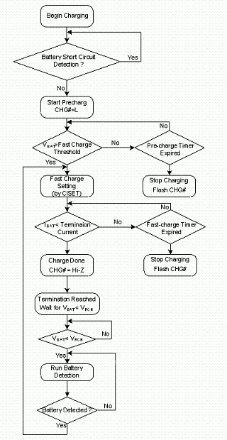 圖6所示為鋰離子電池充電器的標(biāo)準(zhǔn)充電流程,首先充電IC偵測是否有輸出短路或是過載的保護(hù)模式,若系統(tǒng)一切正常接著偵測電池初始電壓是否達(dá)到 3V以上,高于3V者就直接以快充模式進(jìn)行高電流充電,若電池低于3V者,進(jìn)入預(yù)充電模式,以快充的10%進(jìn)行充電,喚醒電池并避免電池?fù)p壞。在預(yù)充電階段,仍隨時偵測電池電壓,達(dá)到3V后可隨即切入快充模式。