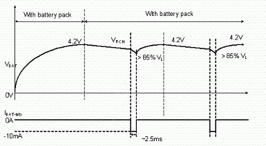 使用者亦有可能在充電或式充電完畢后,在未將電源移除的情況下,即抽離電池的情況。為避免造成危險,IC內(nèi)部應(yīng)具有如圖7, 8的電池存在偵測機(jī)制。充電IC會以短時間脈沖(每370ms產(chǎn)生2ms的脈沖)方式抽取電池電流,此時若電池存在,則偵測到的電池電壓應(yīng)大于一預(yù)設(shè)閥值;若電池已切離,則充電IC偵測到一低電壓,即可判定為電池斷開狀態(tài),并將電池端電壓切斷,保護(hù)使用者安全。