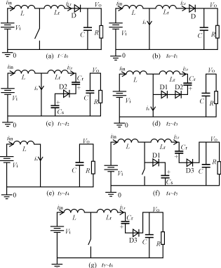 子電路包括一個(gè)電感Lr,兩個(gè)電容Cs、Cr,三個(gè)二極管D1、D2和D3。Lr提供主開(kāi)關(guān)零電流開(kāi)通條件,限制二極管D的反向恢復(fù)電流。電容Cs提供開(kāi)關(guān)零電壓關(guān)斷條件。電容Cr為電感Lr能量恢復(fù)提供能量。這種變換器有七種運(yùn)行模態(tài)。假設(shè)各種元器件為理想元器件,且Cs<Cr。下面對(duì)其進(jìn)行分析。