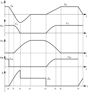從t5開(kāi)始,vcs被鉗在VO,即VCsmax=VO;電源繼續(xù)經(jīng)L,Lr,Cr,D3向負(fù)載供電,電容Cr繼續(xù)放電。t=t6時(shí),電容電壓vcr降到零,同時(shí)電感電流iLr上升到Iin,iLr=Iin,簡(jiǎn)化電路如圖2(g)所示,波形圖如圖3所示。