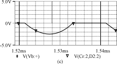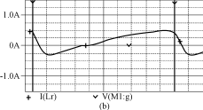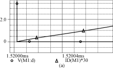 由圖4可知,當(dāng)開(kāi)關(guān)導(dǎo)通時(shí),開(kāi)關(guān)電壓V(M1:d)(Vds)下降,由于電感Lr的作用,電流不能突變,使得開(kāi)關(guān)電流is在開(kāi)關(guān)電壓V(M1:d)(Vds)降到零后,才從零開(kāi)始上升,實(shí)現(xiàn)了開(kāi)關(guān)的零電流導(dǎo)通。當(dāng)開(kāi)關(guān)關(guān)斷時(shí),由于電容Cs的鉗壓作用,開(kāi)關(guān)電壓從低電壓上升,基本實(shí)現(xiàn)零電壓關(guān)斷。而電感電流iLr和電壓vcr波形與理論分析的是一致的。