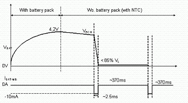 使用者亦有可能在充電或式充電完畢后,在未將電源移除的情況下,即抽離電池的情況。為避免造成危險,IC內(nèi)部應(yīng)具有如圖7, 8的電池存在偵測機制。充電IC會以短時間脈沖(每370ms產(chǎn)生2ms的脈沖)方式抽取電池電流,此時若電池存在,則偵測到的電池電壓應(yīng)大于一預(yù)設(shè)閥值;若電池已切離,則充電IC偵測到一低電壓,即可判定為電池斷開狀態(tài),并將電池端電壓切斷,保護(hù)使用者安全。
