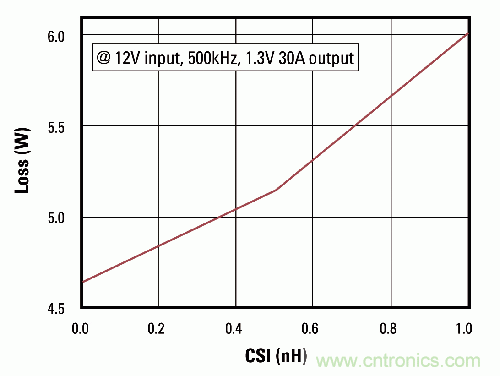 圖1為具備雜散電感和電阻(由封裝鍵合線、引線框以及電路板布局和互連線帶來)等寄生效應的半橋電路。共源電感(CSI)傾向于降低控制FET(高邊FET)的導通和關斷速度。如果與柵極驅(qū)動串聯(lián),通過CSI的電壓加至柵極驅(qū)動上,可使FET處于導通狀態(tài)(條件:V = -Ldi/dt),從而延遲晶體管的關斷。這也會增大控制FET的功耗,如圖2所示。