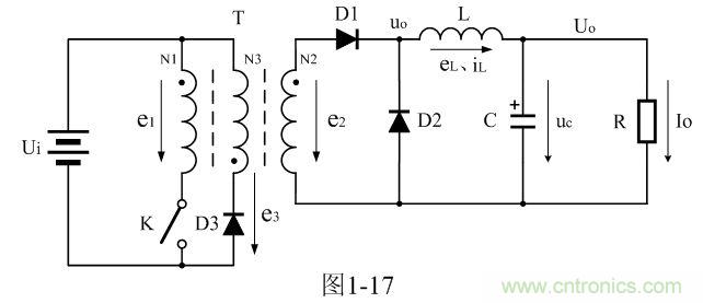 圖1-17是正激式變壓器開關電源的簡單工作原理圖,圖中,Ui是開關電源的輸入電壓,T是開關變壓器,N1、N2、N3分別為開關變壓器的3個線圈繞組,e1、e2、e3分別為3個線圈繞組產生的感應電動勢,K是控制開關,D1是整流二極管,D2是續(xù)流二極管,D3是削反峰整流二極管,L是儲能濾波電感,C是儲能濾波電容,R是負載電阻;uo為整流輸出電壓,或濾波輸入電壓、eL為儲能濾波電感產生的感應電動勢、iL為流過儲能濾波電感L的電流、Uo為濾波輸出電壓、Io為流過負載的電流。