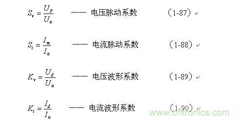 上面4式中,Sv、Si、Kv、Ki分別表示:電壓和電流的脈動系數(shù)S,和電壓和電流的波形系數(shù)K,在一般可以分清楚的情況下一般都只寫字母大寫S或K。脈動系數(shù)S和波形系數(shù)K都是表征電壓或者電流好壞的指標,S和K的值,顯然是越小越好。S和K的值越小,表示輸出電壓和電流越穩(wěn)定,電壓和電流的紋波也越小。當S和K均等于1時,表示電壓和電流均為直流。