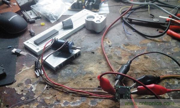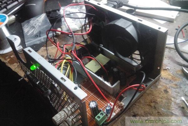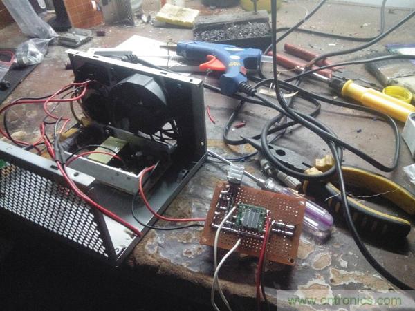 這會算是總裝前測試了,兩根白色線是模塊的軟啟動線,模塊控制腳通過100k電阻到Vcc,所以懸空都能使模塊工作,要讓它停止輸出,直接接地就好了,所以兩根線怎么接,甭說了吧,都懂得。