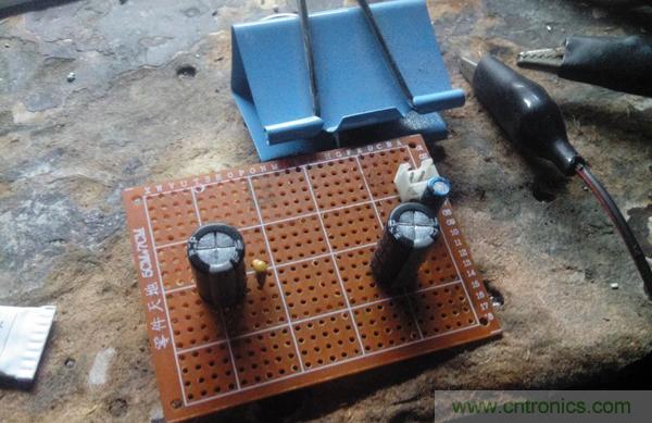 輸入輸出濾波電容以及穩(wěn)壓塊輸出插座焊接好,也有一只220uF的小電容做濾波,藍色燕尾夾是固定穩(wěn)壓塊和散熱片,用的導(dǎo)熱膠粘上去,發(fā)現(xiàn)要是完全固化了,摳都摳不下來。