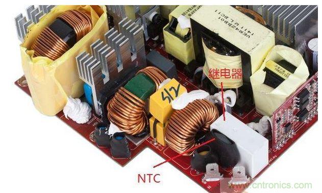 繼電器。安裝在這里的NTC的作用也是抑制電源接通瞬間的浪涌電流,保護(hù)電子設(shè)備。原理簡(jiǎn)而言之就是“阻值隨溫度升高而降低”。舉個(gè)例子,假設(shè)上圖電源的NTC在“零電流通過/零功率”狀態(tài)下的阻值為20歐,當(dāng)機(jī)器冷啟動(dòng)時(shí),瞬態(tài)電流讓NTC阻值急速下降至低于1歐,隨著后續(xù)持續(xù)電流的輸入,NTC持續(xù)發(fā)熱,維持在低阻值,功耗極低。