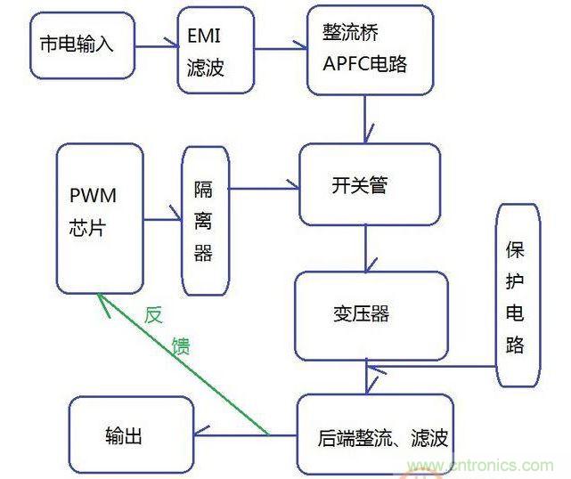 圖1是一個(gè)典型的雙管正激拓?fù)浣Y(jié)構(gòu),肖特基整流、單路磁放大穩(wěn)壓,由CWT代工。1是EMI濾波電路。2主要是APFC(主動(dòng)式功率因數(shù)校正),主要包括整流橋、主動(dòng)PFC電感和升壓電容、PWM芯片。3主要包括變壓器和磁放大電感、待機(jī)驅(qū)動(dòng)芯片。4是后端整流,二次側(cè)(輸出端)電路。兩條散熱片上,2和3間釘著開關(guān)管,3和4間釘著整流管。圖上沒框住的還有三顆光耦,沒特意標(biāo)出的有保護(hù)電路、輸出線材、背部元件、電路板等。大體示意圖表示如圖2: