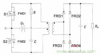 當(dāng)S1開(kāi)通時(shí),其漏源電壓uDS1只是一個(gè)開(kāi)關(guān)管的導(dǎo)通壓降,在理想情況下可假定uDS1=0,而此時(shí)由于在繞組中會(huì)產(chǎn)生一個(gè)感應(yīng)電壓,并且根據(jù)變壓器初級(jí)繞組的同名端關(guān)系,該感應(yīng)電壓也會(huì)疊加到關(guān)斷的S2上,從而使S2在關(guān)斷時(shí)承受的電壓是輸入電壓與感應(yīng)電壓之和約為2UI.在實(shí)際中,變壓器的漏感會(huì)產(chǎn)生很大的尖峰電壓加在S2兩端,從而引起大的關(guān)斷損耗,變換器的效率因受變壓器漏感的限制,不是很高。在S1和S2的漏極之間接上RC緩沖電路,也稱為吸收電路,用來(lái)抑制尖峰電壓的產(chǎn)生。并且為了給能量回饋提供反饋回路,在S1和S2兩端都反并聯(lián)上續(xù)流二極管FWD.