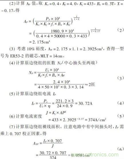 采用面積乘積(AP)法進(jìn)行設(shè)計(jì)。對(duì)于推挽逆變工作開(kāi)關(guān)電源,原邊供電電壓UI=24V,副邊為全橋整流電路,期望輸出電壓UO=220V,輸出電流IO=3A,開(kāi)關(guān)頻率fs=25kHz,初定變壓器效率η=0.9,工作磁通密度Bw=0.3T.