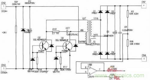 以CA3524芯片為核心,構(gòu)成控制電路。通過(guò)調(diào)節(jié)6、7管腳間的電阻和電容值來(lái)調(diào)節(jié)全控型開(kāi)關(guān)器件的開(kāi)關(guān)頻率。12、13管腳輸出PWM脈沖信號(hào),并通過(guò)驅(qū)動(dòng)電路,分別交替控制兩個(gè)全控型開(kāi)關(guān)器件。電壓反饋信號(hào)輸入芯片的1管腳,通過(guò)調(diào)節(jié)電位器P2給2管腳輸入電壓反饋信號(hào)的參考電壓,并與9管腳COM端連同CA3524內(nèi)部運(yùn)放一起構(gòu)成PI調(diào)節(jié)器,調(diào)節(jié)PWM脈沖占空比,以達(dá)到穩(wěn)定輸出電壓220V的目的。