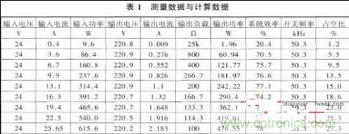 實(shí)驗(yàn)結(jié)果表面,輸出電壓穩(wěn)定在220V,紋波電壓較小。最大輸出功率能達(dá)到近600W,系統(tǒng)效率基本穩(wěn)定在80%,達(dá)到預(yù)期效果。如下表1所示。