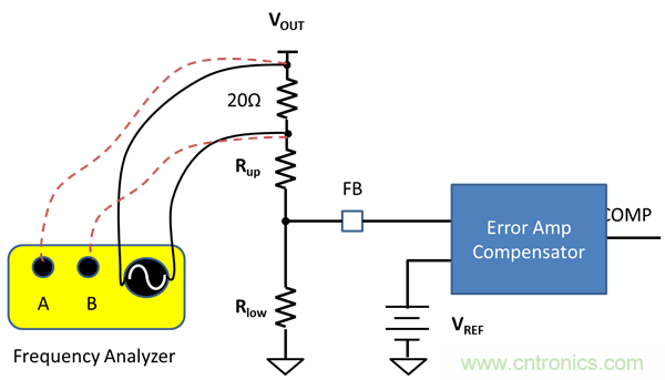 為了保持準(zhǔn)確度,將一個(gè)旁路電容器(Cpass)并聯(lián)添加到20Ω的電阻器。這個(gè)20Ω的電阻器和Cpass形成了一個(gè)高通濾波器。轉(zhuǎn)角頻率設(shè)置得比轉(zhuǎn)換器開(kāi)關(guān)頻率的一半還低,以便FB引腳處的三角波形在測(cè)試過(guò)程中與在正常運(yùn)行期間基本相似。