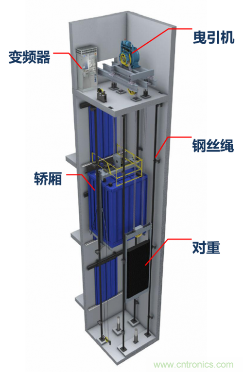 傳統(tǒng)電梯的動力部分主要由曳引機(卷揚機)、變頻器、轎廂、鋼絲繩、對重組成。曳引機通過卷動鋼絲繩,調(diào)節(jié)轎廂和對重的平衡,實現(xiàn)對轎廂高度的控制,即電梯的上下。其中曳引機本質(zhì)就是一臺由變頻器驅(qū)動與控制的大功率電機,需要安置在大樓頂層——這就造成了電梯無法上頂層的問題了,因為頂層的電梯位置被曳引機和變頻器占據(jù)了。這問題一直存在了很久的時間,因為過去曳引機基本都用交流異步電機,且功率輕松上幾十KW,體積非常大,且不能露天放置,只能一直占著頂樓的房間。