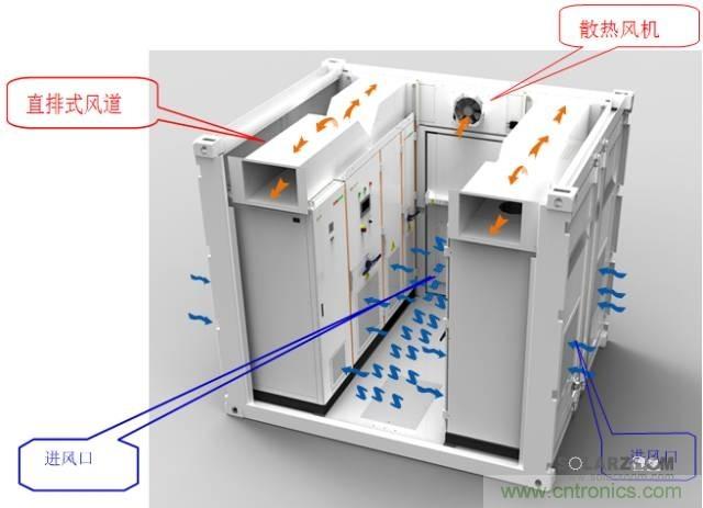 陽光電源箱式逆變房將逆變器、直流柜、通訊單元集成于一體,采用簡潔的分段直排式風道,風道內不含風機,零損耗,免維護。風道長度僅1m,壓力損失小,風機處于最佳效率狀態(tài)。逆變器在工作時,大部分熱量通過風道排出集裝箱外,僅有少量熱量通過輻射傳到箱體內部,內部空氣吸收熱量后向頂部流動,再由集裝箱頂部排風扇排出,確保了逆變器的長期可靠運行。
