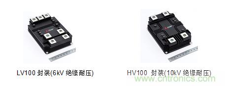 首次亮相展會的X系列雙管HVIGBT模塊,采用CSTBTTM 結構的第7代IGBT和RFC二極管,降低功率損耗;運用可降低內部電感的封裝技術,優(yōu)化產品性能;使用兩種封裝(LV100/HV100),實現兩種絕緣耐壓(6kV/10kV),但兩者具有相同的外形尺寸。LV100封裝包括900A/1.7kV和450A/3.3kV;HV100封裝包括450A/3.3kV、330A/4.5kV和225A/6.5kV;可提高系統(tǒng)結構設計的靈活性,方便實現逆變器擴容。