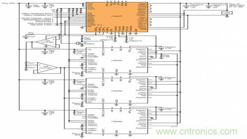 µModule DC/DC 穩(wěn)壓器可提供一種同時(shí)提供高功率輸出和 DPSM 功能的簡(jiǎn)單和有效之方法。由于可容易地通過(guò)并聯(lián)多個(gè) µModule 穩(wěn)壓器以提供高電流輸出 (各個(gè)通道彼此之間的電流匹配準(zhǔn)確度標(biāo)稱(chēng)值在 1% 以內(nèi)),從而降低了產(chǎn)生熱點(diǎn)的可能性。而且,只有其中一個(gè) µModule 穩(wěn)壓器必需具備 DPSM 能力,原因是即使并聯(lián)的 µModule 未內(nèi)置固有的 DPSM,它也能提供完整的數(shù)字接口。圖 2 示出了一個(gè) LTM4677 (36A DPSM µModule) 與 3 個(gè) LTM4650 (50A µModule) 相并聯(lián)的應(yīng)用電路原理圖。