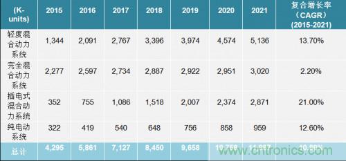 如表1所示,每部車輛都可能搭載1到4個電機(jī)。(搭載4個電機(jī)是出于每個輪胎都需要一臺電機(jī))。每臺使用的電機(jī)都將需要搭配合適的系統(tǒng),以安全高效地驅(qū)動與控制這些電機(jī)。這些系統(tǒng)需要具備控制可見性和粒度,以實現(xiàn)合適的扭矩與電機(jī)控制。牢記電機(jī)與其控制系統(tǒng)需要的知識,表2(同樣來自Strategy Analytics的報告)給2015-2021期間市場上的每種類型車輛的數(shù)量一個估計值
