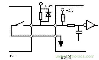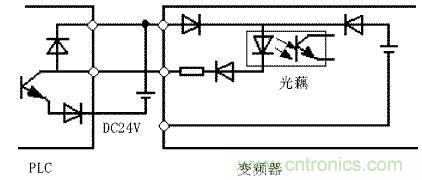 當(dāng)輸入開(kāi)關(guān)信號(hào)進(jìn)入變頻器時(shí),有時(shí)會(huì)發(fā)生外部電源和變頻器控制電源(DC24V)之間的串?dāng)_。正確的連接是利用PLC電源,將外部晶體管的集電極經(jīng)過(guò)二極管接到PLC。如圖4所示。