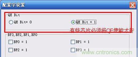 芯片中的配置參數(shù)需要手動修改,不能單純的加載文件后直接進行燒錄,如果不按照正確的規(guī)則設置參數(shù),必然會導致芯片無法正常運行。在SPI Flash的芯片燒錄時經(jīng)常遇到這類問題,類似于”QE”位必須使能,如下圖。
