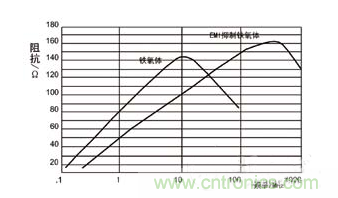 鐵氧體的效果隨著頻率的升高而增加。鐵氧體扼流圈的阻抗在10MHz處通常為幾十歐姆,當頻率超過100MHz時,阻抗升高到數(shù)百歐姆(具體值取決于形狀和尺寸,鐵氧體體積越大,阻抗越大)。不同廠家的產(chǎn)品或同一廠家的不同種類的鐵氧體,其阻抗隨頻率的變化都有所不同。圖5是尺寸相同(外徑為5mm,長度為11mm)但材料不同的兩種鐵氧體的特性。