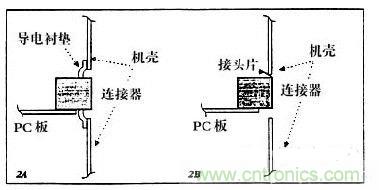 屏蔽連接器方法有,加指形簧片或墊片。連接器的搭接,是在連接器和機(jī)殼之間填滿空處。這個(gè)方法要求有一個(gè)襯墊(圖2A)。金屬襯墊較好,只要處理合適,也就是說,只要表面不被污染,只要手不觸及或損壞襯墊以及只要有足夠的壓力,以保持好的、低阻抗的接觸。