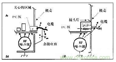 使共模電流注入到I/O區(qū)的另一機(jī)理,是附近有強(qiáng)的干擾源的耦合。甚至有些“屏蔽”連接器也無用,因?yàn)楦蓴_源就在連接器附近,如PC機(jī)環(huán)境。如果在連接器和底板之間有一個(gè)缺口,此處所感應(yīng)的RF電壓可以使EMC性能下降(圖1B)。