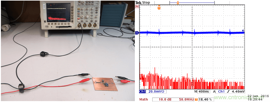 這種環(huán)形天線可以被連接到頻譜分析儀上,當(dāng)你使它在PCB上方移動(dòng)時(shí),你就可以看到哪里會(huì)有比較強(qiáng)的高頻磁場(chǎng)。你也可以把它連接到一臺(tái)示波器上(使用50Ω的端子),示波器上就可以顯示出相應(yīng)區(qū)域的切換噪聲水平。保持天線環(huán)和板子之間的相對(duì)位置和距離不變,對(duì)電路、PCB上的回路做出某些改變,你就可以知道噪聲水平在增加或是減少。