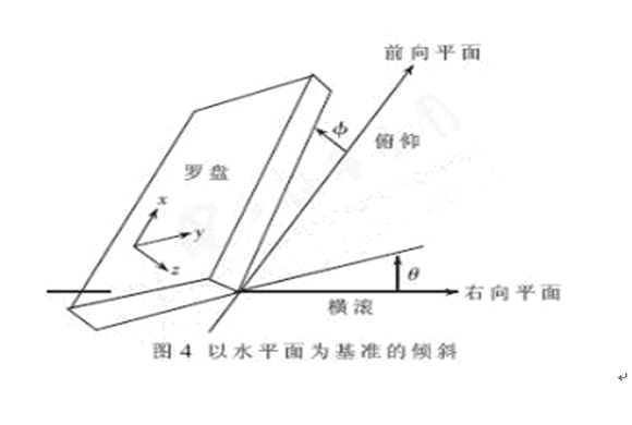 地球磁場的強度為0.6高斯左右,現(xiàn)有的磁阻傳感器可以很好地測量地磁場范圍內(nèi)的磁場強度。由于二維羅盤只能在保持水平的情況下正常工作,如果用于車輛的動態(tài)環(huán)境中,將不可能保證其永遠水平,所以在這種場合下,羅盤的可使用性大大降低。于是需要設(shè)計三維羅盤以適應(yīng)各種姿態(tài)的測量。三維電子羅盤的總體設(shè)計方案如圖3所示。三軸磁阻傳感器分別從X、Y、Z 三個磁場強度方向輸出電壓,經(jīng)過放大電路分別輸入到三個具有A/D轉(zhuǎn)換能力的MCU端口,二軸加速度傳感器測量俯仰角度和橫滾角度,測量參數(shù)的意義如圖4所示。