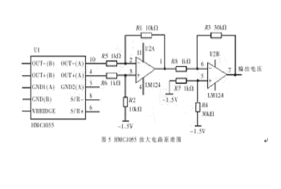 各向異性磁阻(AMR)傳感器由惠斯頓電橋進行工作,并且傳感器輸出電壓很小,需要放大才能進行A/D轉(zhuǎn)換。下面以HMC1052為例進行分析。HMC1052的靈敏度為±1.0mV/V/高斯,電橋偏置電壓值為±1mV/V。在橋路電壓3V和625毫高斯最大的磁場強度下,橋路偏置電壓為: