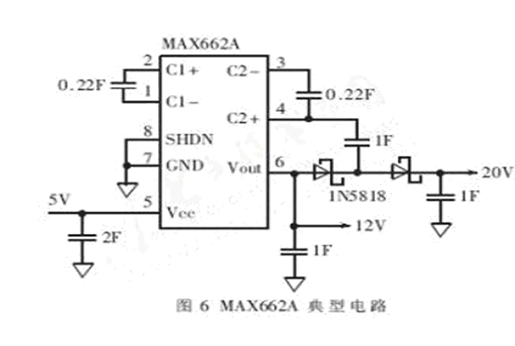 在HMC1055芯片上,置位/復(fù)位片的引腳名稱是S/R+和S/R-,沒有極性的區(qū)別,單個置位/復(fù)位帶標準阻值為2.0Ω,所以對于三軸系統(tǒng),三個金屬片串聯(lián)阻值為6.0Ω,則產(chǎn)生一個3~4A的最小脈沖驅(qū)動一個6Ω的負載所需的供電電壓為18V~24V。由于系統(tǒng)芯片都是使用5V電源,所以需要將5V電壓升壓到20V左右,可以使用MAX662來完成。典型的電路如圖6所示。