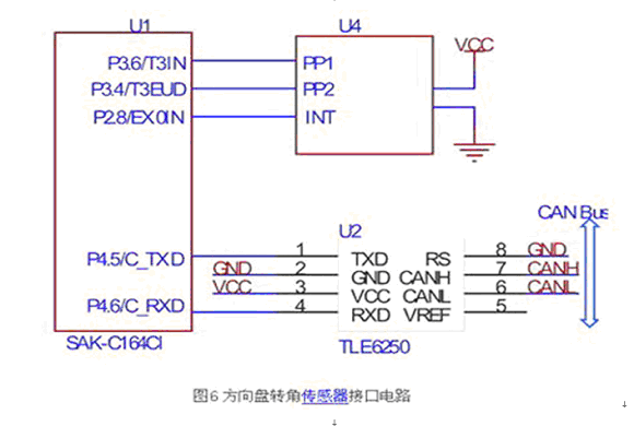 C164CI與方向盤轉(zhuǎn)角傳感器的接口電路如圖6所示。片內(nèi)內(nèi)置增量編碼的正交解碼器,該解碼器使用定時(shí)器3的兩個(gè)引腳(T3IN、T3EUD)作為正交脈沖的輸入,在正確設(shè)置相關(guān)寄存器后,定時(shí)器3的數(shù)據(jù)寄存器的值與方向盤轉(zhuǎn)角成正比,故可方便的計(jì)算轉(zhuǎn)角,本文所使用的方向盤轉(zhuǎn)角傳感器每一圈對應(yīng)44個(gè)脈沖,設(shè)定時(shí)器3的數(shù)據(jù)寄存器為T3,則絕對轉(zhuǎn)角為。