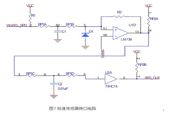 根據(jù)前面部分介紹的輪速傳感器信號特點(diǎn),設(shè)計(jì)接口電路如圖7所示。
