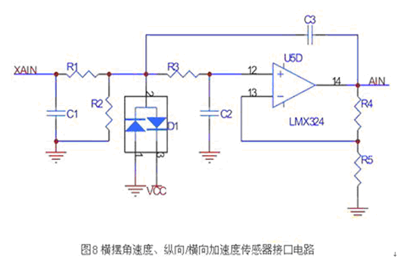 橫擺角速度、縱向/橫向加速度傳感器的安裝位置基本相同,輸出都是0V-5V的模擬量,由于汽車顛簸造成的信號波動特性一致,故封裝在同一模塊中。其硬件接口如圖8所示,實(shí)現(xiàn)硬件模擬前置濾波,以抑制來自傳感器的模擬信號中的高頻噪聲成分,防止在采樣過程中出現(xiàn)混疊現(xiàn)象。運(yùn)放使用滿擺幅輸出的LMX324。