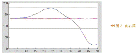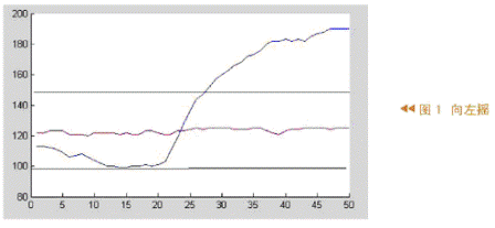 從圖1和圖2中可以看出,兩條黑線之間的數(shù)據(jù)很難斷定是哪個(gè)動作產(chǎn)生的,因?yàn)閮蓚€(gè)動作都可能產(chǎn)生這樣的值。所以,利用黑線之外的數(shù)據(jù)來判定是向右還是向左搖。因?yàn)閷τ谶@兩個(gè)動作,黑線之外的數(shù)據(jù)有明顯的差異,數(shù)據(jù)相差很多。對于圖1這些數(shù)據(jù)大于150,圖2中這些數(shù)據(jù)小于90。因此這些數(shù)據(jù)至少相差60,可以很容易地將向左、向右的兩個(gè)動作區(qū)分開。