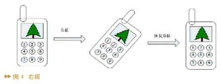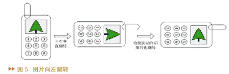系統(tǒng)設(shè)計(jì)了六種動作,他們分別是左搖、右搖、下?lián)u、上搖、圖片左轉(zhuǎn)、圖片右轉(zhuǎn)。圖4中的圖形象地說明了其中的兩個(gè)動作,其它的動作與此類似。