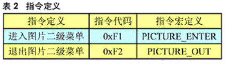 系統(tǒng)還定義了單片機(jī)與演示終端交互的指令,用于系統(tǒng)在主菜單和二級菜單之間的界面切換,指令從演示系統(tǒng)通過SCI傳給單片機(jī),單片機(jī)接收到之后進(jìn)入或退出二級菜單,見表2。