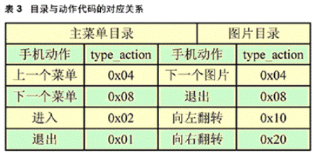 仿真器的外觀和操作類似一部移動電話,但是并不代表某個(gè)特定的設(shè)備,而是提供對其所支持的API 的正確實(shí)現(xiàn),每個(gè)命令按鈕對應(yīng)著相應(yīng)的API函數(shù)。從圖6中可以看到手機(jī)的導(dǎo)航鍵,我們更改了導(dǎo)航鍵的API函數(shù),使其從鼠標(biāo)單擊觸發(fā)的方式轉(zhuǎn)換為串口動作代碼控制。首先,我們編寫了J2ME的串口接收程序,用于接收從單片機(jī)傳來的單字節(jié)的type_action值;然后將type_action以參數(shù)的形式傳給API,手機(jī)根據(jù)不同的type_action值執(zhí)行不同的動作,包括菜單上下翻、進(jìn)出二級子菜單、圖片翻轉(zhuǎn)等。手機(jī)動作與type_action的對應(yīng)關(guān)系如表3。