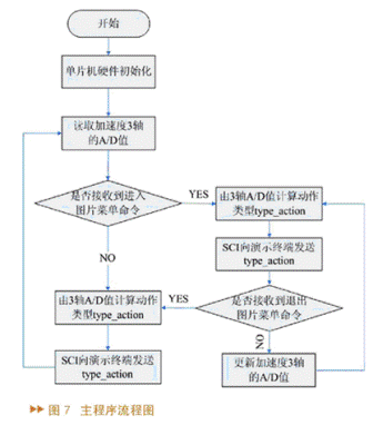 系統(tǒng)上電后,首先要對單片機(jī)的硬件系統(tǒng)進(jìn)行初始化、配置寄存器等操作,之后才可以進(jìn)行數(shù)據(jù)采集,將加速度的值進(jìn)行A/D轉(zhuǎn)換,得到量化的值。圖片菜單是二級菜單,如果沒有接到演示系統(tǒng)傳給單片機(jī)進(jìn)入二級菜單的指令,則單片機(jī)一直在主程序運(yùn)行,不斷地采集A/D值、進(jìn)行動作判定,并向演示系統(tǒng)發(fā)送type_action的指令。演示系統(tǒng)可根據(jù)接收到的type_action的類型采取相應(yīng)的動作。如果單片機(jī)接收到進(jìn)入二級菜單的命令,則進(jìn)入圖片菜單,同時(shí)也執(zhí)行類似于主程序的動作判定程序,并不斷更新A/D采樣值,發(fā)送type_action,直到接收到退出二級菜單指令才退出。下面詳細(xì)介紹一下各個(gè)功能模塊的具體設(shè)置。