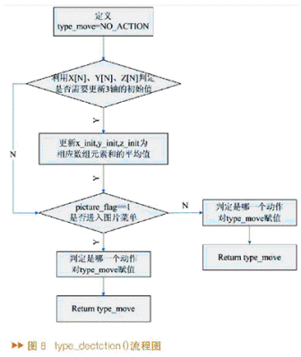 動作檢測主要是用獲得的三組數(shù)據(jù)值x_data[N]、y_data[N]、z_data[N]來判定當(dāng)前動作是系統(tǒng)設(shè)定動作中的哪一個(gè),如果符合,則發(fā)送這個(gè)動作對應(yīng)的預(yù)定義值給演示終端,否則發(fā)送NO_ACTION。type_dectction()用來實(shí)現(xiàn)動作檢測,其中type_move為函數(shù)內(nèi)部變量,用于記錄動作代碼。type_dectction()進(jìn)行動作檢測的流程如圖8所示。