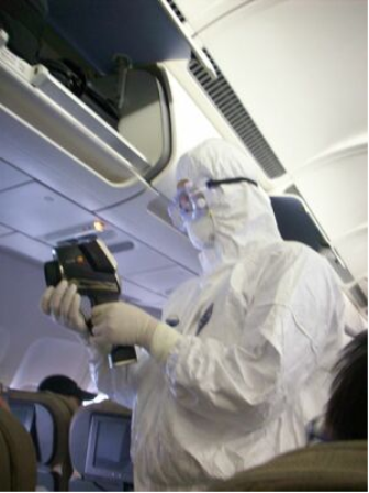 2009年4月29日晨5點(diǎn)58分,甲型H1N1流感擴(kuò)散以來首架抵達(dá)中國(guó)的墨西哥航班AM098航班降落于浦東機(jī)場(chǎng)。旅客下機(jī)之前,檢驗(yàn)檢疫人員身穿防護(hù)服,手持德圖精密型紅外測(cè)溫儀testo845,登機(jī)對(duì)所有乘客進(jìn)行體溫檢測(cè)。