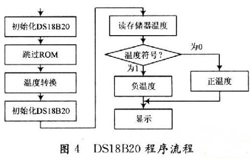要進(jìn)行溫度控制,首先要測量所控制目標(biāo)的溫度值,在本系統(tǒng)中,具體使用數(shù)字溫度傳感器DSl8B20與DSP結(jié)合,并利用CCS編寫程序,本系統(tǒng)開發(fā)平臺為CCS 2.2,前期安裝及芯片設(shè)置在此省略,程序流程如圖4所示。
