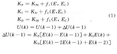 根據(jù)前面敘述,用DSl8B20讀取溫度采樣值,再通過參數(shù)自整定的Fuzzy-PID算法對數(shù)據(jù)進(jìn)行處理:根據(jù)E和Ec的狀況,由模糊控制規(guī)律再通過模糊表推導(dǎo)出△KP,KI,KD,根據(jù)式(1)計算出KP,KI,KD的大小,再計算出U的初值和△U,由式(2)實時計算控制量U。通過參數(shù)轉(zhuǎn)換,將U轉(zhuǎn)換為PWM參數(shù),修改EvaRegs.CMPRl的數(shù)值,改變PWM的占空比,從而控制TEC的制冷/制熱功率。