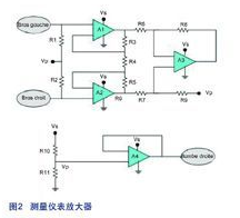 正如上述所說(shuō),ECG的信號(hào)路徑必須能調(diào)理不同來(lái)源的噪聲。對(duì)抗直流電噪聲,可以使用高通濾波器。然而,最令人頭痛的是50Hz的噪聲,因?yàn)樗鼊偤门c我們收集的信號(hào)頻率處于相同范圍。要消除這個(gè)共模噪聲,需要建立一個(gè)測(cè)量?jī)x表放大器。這個(gè)配置之所以很理想是因?yàn)樗稍谝种乒材k妷旱耐瑫r(shí)放大有用的差分信號(hào),這利于把微弱的有效信號(hào)從背景噪聲中分隔出來(lái)。正如圖2所示,這個(gè)儀表放大器是用LMP2234(四通道、微功率、高精度的RRO運(yùn)算放大器)和高精度的電阻器(0.1%)實(shí)現(xiàn)出來(lái)?! ?br />