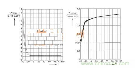 在鋁電解高壓電容器的正常運行過程中,其本身的電解液導(dǎo)電性,將會隨著環(huán)境溫度的降低而降低,從而會導(dǎo)致電解液阻抗的增加,阻抗和損耗角正切也會因此而增大。在絕大多數(shù)應(yīng)用中,相應(yīng)增加僅允許到某最大值。在這里需要強調(diào)的一點是,低于上述溫度限值的工作并不會損壞高壓電容,僅僅只是會影響其使用壽命,尤其是當(dāng)紋波電流流經(jīng)器件時,由于增加ESR而產(chǎn)生的熱量耗散會提高電容器溫度,使其遠大于環(huán)境溫度,使電容可維持設(shè)備運行。下圖所示為下限類別溫度為-25℃電容器的阻抗和電容典型值。
